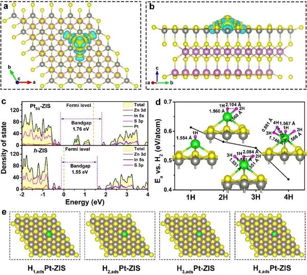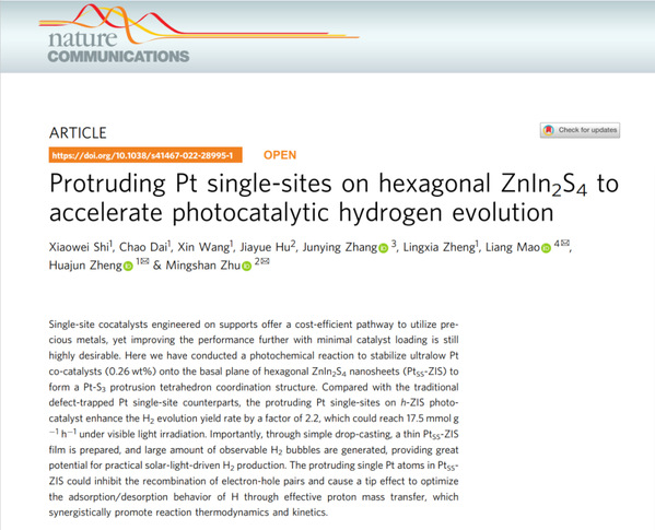 为了更好地说明该结构能够有效提高材料的产氢活性,研究团队还设计了一种非凸起状的铂原子,即在硫铟锌表面把一个硫原子拿走,制造了一个硫“空位”,然后再将铂原子填充在这个硫空位中。通过计算发现,这个限域在二维纳米片面内的铂原子仅能吸附一个氢原子,因此其产氢性能只有凸起状铂原子的二分之一。上述研究成果于2022年3月11日被Nature Communications在线报道。