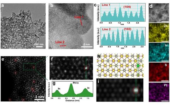 为了验证这个设想,研究团队通过实验表征和理论计算来加以论证。研究团队在球差矫正透射电镜下清晰地发现,铂单原子与二维硫铟锌纳米片表面上的三个S原子成键,形成独特的类似于金字塔结构的Pt-S3结构。这个结构使得多个氢原子能自发地吸附在凸起状铂单原子上,有利于产氢反应的进行。