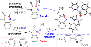 该研究通过密度泛函理论(DFT)计算阐明了5-exo和6-endo Heck环化/交叉偶联反应机理。计算结果表明无论采用双齿配体L1还是三齿配体L2,在环化步骤均有利于生成5-exo偶联产物。此外,研究发现三齿配体L2可以促进反应发生1,2-芳基迁移。三齿配体L2由于羧基的存在,NiIII-烷基中间体保持六配位结构不变,使1,2-芳基迁移容易进行,5-exo环化中间体扩环得到6-endo中间体,进而得到6-endo偶联产物(图1)。相比之下,双齿配体L1参与的1,2-芳基迁移反应中,由于NiIII-烷基中间体从六配位结构转化为不稳定的五配位结构,不利于此过程的发生,反应得到5-exo偶联产物。