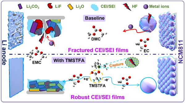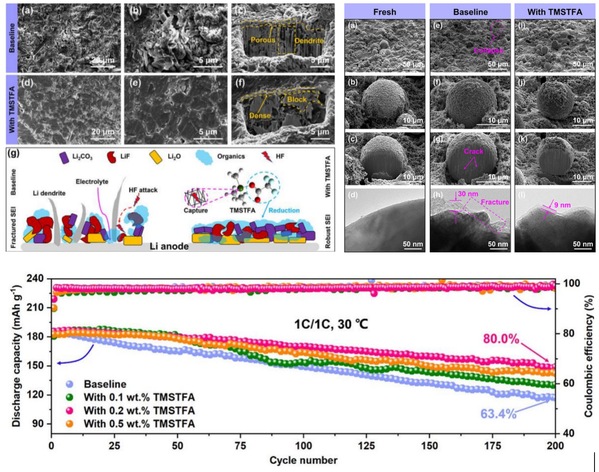鉴于此,化学工程乐鱼leyu(中国)高云芳教授团队通过在电解液中添加TMSTFA(三氟乙酸三甲基硅酯),显著改善锂金属负极及NCM811正极的界面稳定性,同时稳定LiPF6基电解液。