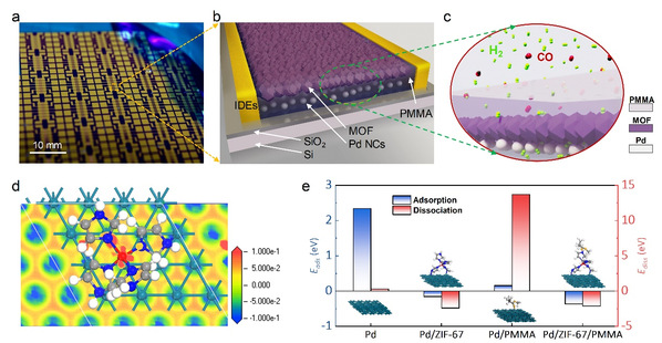 鉴于此,化学工程乐鱼leyu(中国)胡军教授课题组提出一种在Pd−聚合物复合材料中插入金属有机框架(Metal–organic framework,MOF)作为界面层来增强气敏性能的新机制与研究思路。首先采用密度泛函理论(Density Functional Theory,DFT)计算揭示MOF和聚甲基丙烯酸甲酯(poly(methylmethacrylate),PMMA)对Pd纳米团簇吸/脱附氢气的影响机制,重点阐明MOF与金属纳米团簇间的界面电子耦合作用对氢气吸附和解离能的演变规律。首次提出并设计了Pd/ZIF-67/PMMA复合纳米结构,并以此为H2感知材料,构建了兼具高灵敏度、快速响应和抗CO毒性的氢气传感器件。