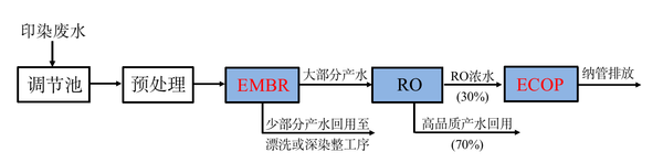 团队创新研发了抗污染MBR膜组件、节能型低曝气装置、耐污染高通量反渗透膜、抗污染耐氧化进水隔网和低污染反渗透膜元件,开发了原位增强MBR生化处理(EMBR)、高效反渗透浓缩回用(RO)和特种电催化氧化处理膜浓缩液(ECOP)等关键技术,并集成构建了以“EMBR+RO”双膜法为核心、耦合ECOP的新型印染废水资源化处理技术,可将印染废水回用率最高提升至80%以上,平均回用率稳定在70%以上;纳管排放废水COD降低至65mg/L左右,锑浓度低于0.1mg/L,苯胺类物质无检出,总氮低于15mg/L,且可生化性大幅提升,大大降低园区集中处理负担;废水处理成本低于1.8元/m3水,能耗降低约15%左右,具有显著的经济、环境和社会效益。