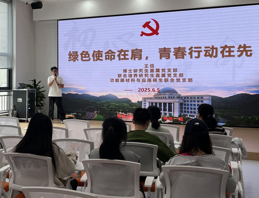 2025年6月5日下午3点,博士研究生直属党支部、联合培养研究生直属党支部、功能膜材料与应用师生联合党支部在莫干山校区图书馆东侧三楼党群服务中心举办了以“绿色使命在肩,青春行动在先”为主题的红色半月谈主题党课。本次党课有幸邀请到了王俭老师作为主讲人,带领同学们深入探讨了青年在环境保护和生态文明建设中的使命与责任。