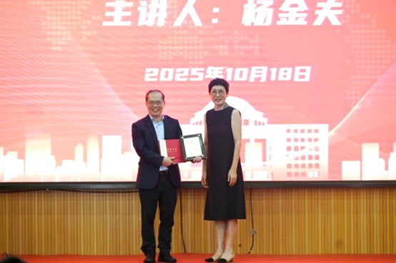 开讲前,应四爱为杨金夫颁发精弘校友讲坛主讲人聘书并赠送书籍《我的大学》。
