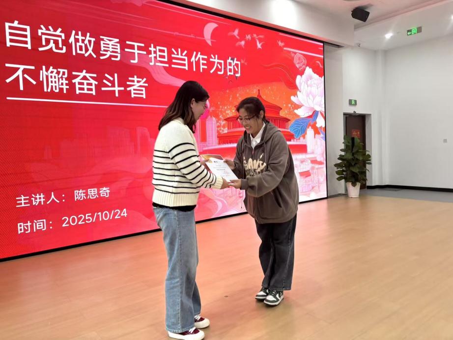 报告以习近平总书记“做不懈奋斗者”的重要论述为主线,结合中国共产党百年奋斗历程中的典型案例,系统阐释了新时代担当精神的核心内涵。陈思奇老师指出,担当作为是融入党员干部血脉的政治基因,尤其在2025年这一“十四五”规划收官与“十五五”规划谋划的关键节点,面对科技攻关、乡村振兴等重大任务,党员干部更需发扬“愿挑重担、敢啃硬骨”的奋斗精神。