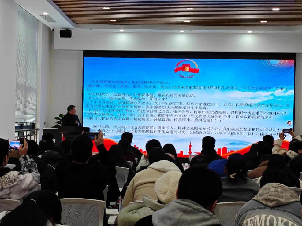 宣讲尾声,张福良同志引用习近平总书记对伟大抗战精神的精辟概括,从爱国情怀、民族气节、英雄气概、必胜信念四个维度,为在场研究生党员解读精神传承的实践路径。他结合化学工程学科特色勉励大家:“抗战时期先辈们用血肉之躯筑防线,今天你们要在膜分离、绿色化工等领域筑科技防线,把‘不畏强暴、血战到底’的精神转化为攻克‘卡脖子’技术的勇气,用科研成果践行‘绿研报国’的初心。”