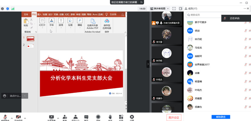 2022年5月10日晚18:30,催化剂工程方向研究生第二党支部于钉钉线上举行2022年上半年党员转正与发展转预备大会,大会由党支部副书记俞夏琪主持,参会人员有学生党支部全体正式党员、预备党员。1、预备党员转正答辩预备党员转正答辩流程主要由党支部副书记俞夏琪同志负责,其中组织委员张贤洁负责线上选票制作,党建联系人王亚秋与组织委员张贤洁负责线上会议设备准备、会议记录。刘娜娜、于瑄、龚柳枝、王潇剑、王梦欣、张世杰、时怀杰、王朝晖8位预备党员在线上汇报了预备期间自己在思想,生活,工作等各方面的情况。然后由他们对应的党建联系人向大会介绍其在预备期的培养考察情况,支委会向支部大会报告了他们对预备党员的审查情况,与会党员对预备党员是否符合党员条件发表了意见。各位预备党员精神抖擞,按照流程有条不紊地进行本次支部大会。经过线上投票表决,8位预备党员均全票通过党员决议,成为中共正式党员。2、拟发展对象转预备江文杰、李岩峰、汪潇洒、孙富丽4位发展对象在线上汇报了自己对党组织的认识、入党动机、本人履历、现实表现以及应向党组织说明的其他问题等。然后,由他们对应的入党介绍人向大会介绍申请人的基本情况和本人意见,